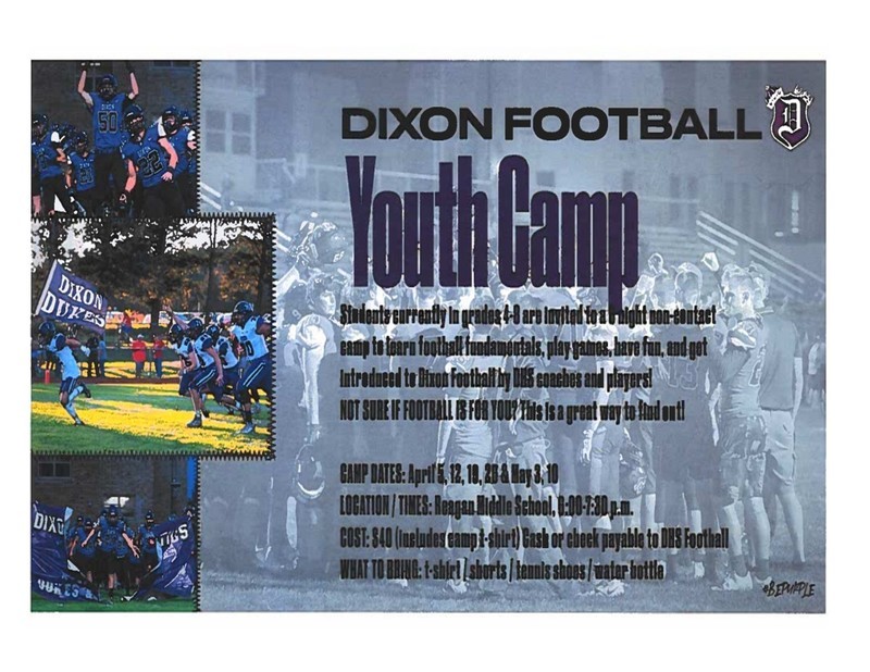 Dixon Football will be hosting a Spring Youth Camp for students currently in grades 4-8. Not sure if football is for you? This is a great way to find out. Check out the flyer at - https://5il.co/1r812
