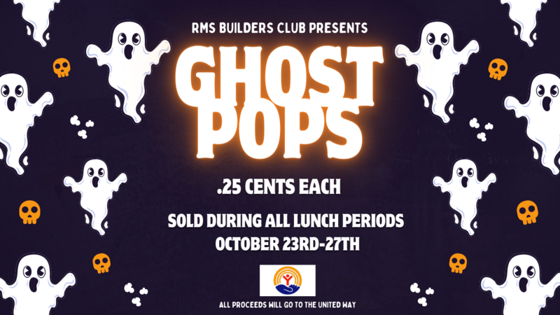 RMS Builder's Club will be selling Ghost Pops for 25 cents each during all lunch periods October 23rd-27th. All proceeds will be donated to the United Way of Lee County!!!